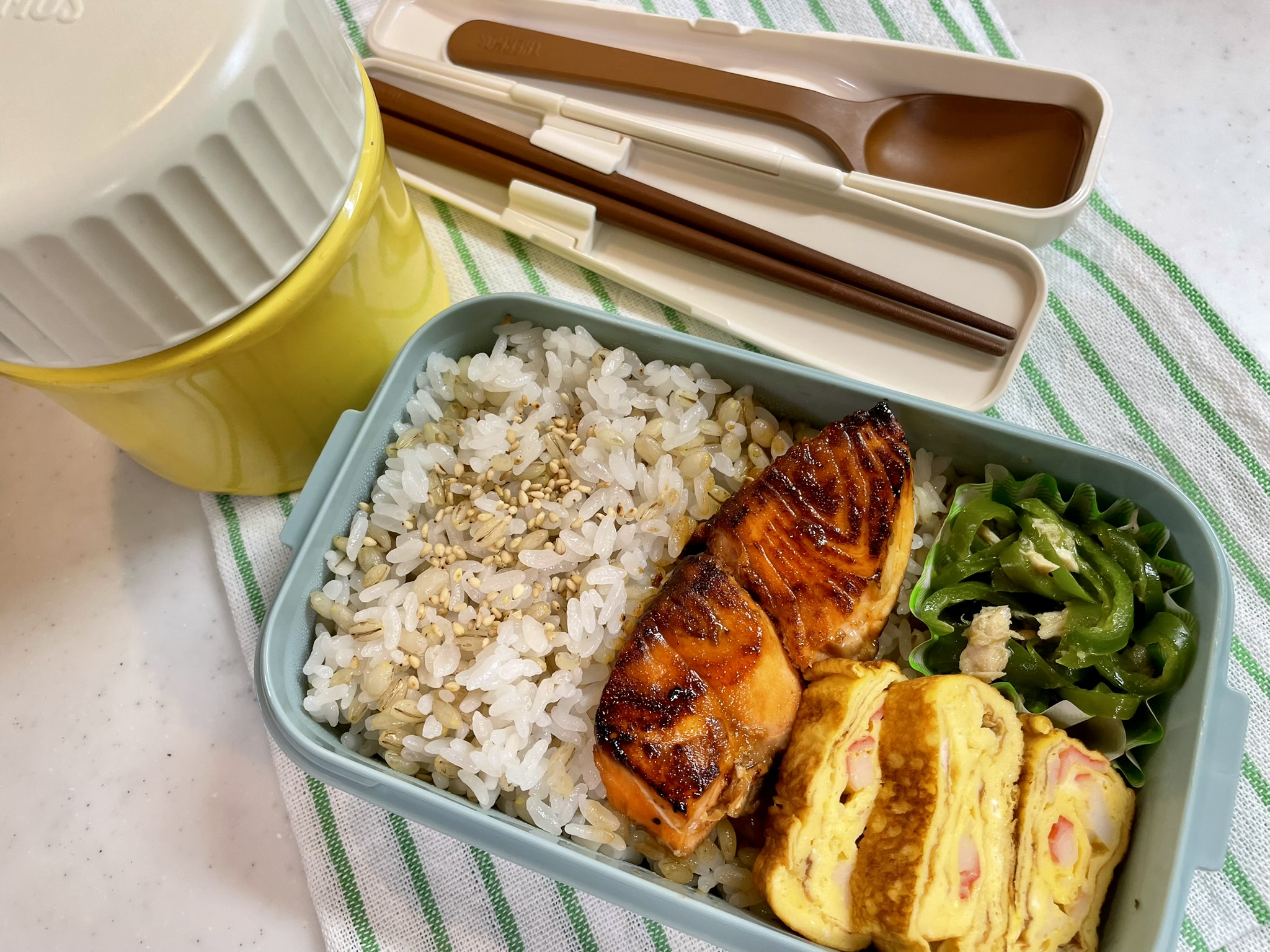- 基本構成: ご飯 + タンパク質1品 + 野菜1品 + 卵焼き 卵焼きだけは毎日、ネギを入れたりカニカマを刻んだりと、小さな変化を楽しんでいます。