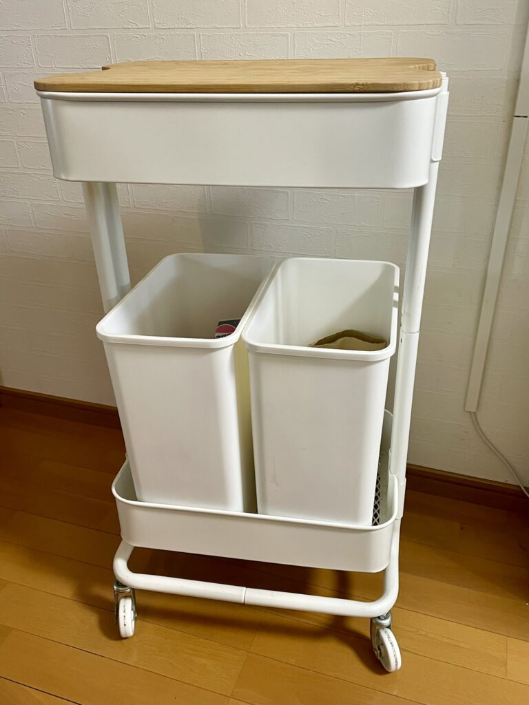 IKEAの超定番ワゴン「ロースコグ(RÅSKOG)」。普通は3段で使いますが、私はあえて「中段」を外して使っています。