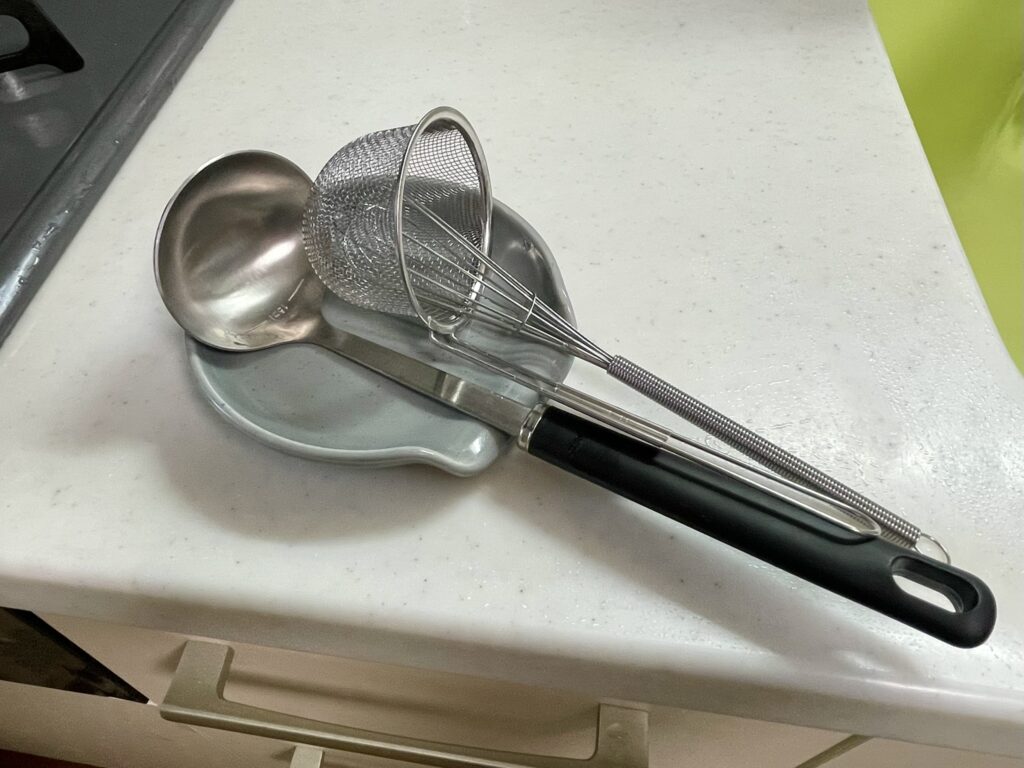 このおたま置き、幅がしっかりあるのがポイント。 お味噌汁を作る時の「小さめおたま」「味噌こし網」「小さい泡だて器」を、なんと同時にホールドしてくれます。