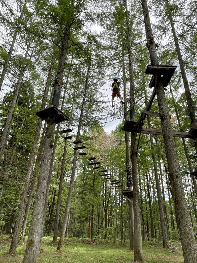 旅の締めくくりは、白馬の森に広がる本格アスレチック。 地上10メートル近いスリリングなコースに、親のほうがハラハラ!しかし息子はひるむことなく次々とクリア。高いところも恐れずチャレンジする姿に、この旅一番の「成長」を感じて胸が熱くなりました。
