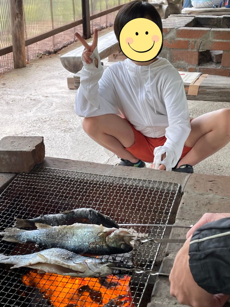 - 家族で囲む炭火の味 夫と息子が協力して火を起こし、自分たちで焼き上げたマスの味は格別。自分で獲って、さばいて、焼く。最高の食育体験になりました。